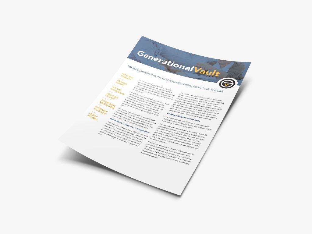 As our client, you have complimentary access to Generational Vault®, a proprietary online portal designed to bring convenience, clarity, and transparency to your financial life.